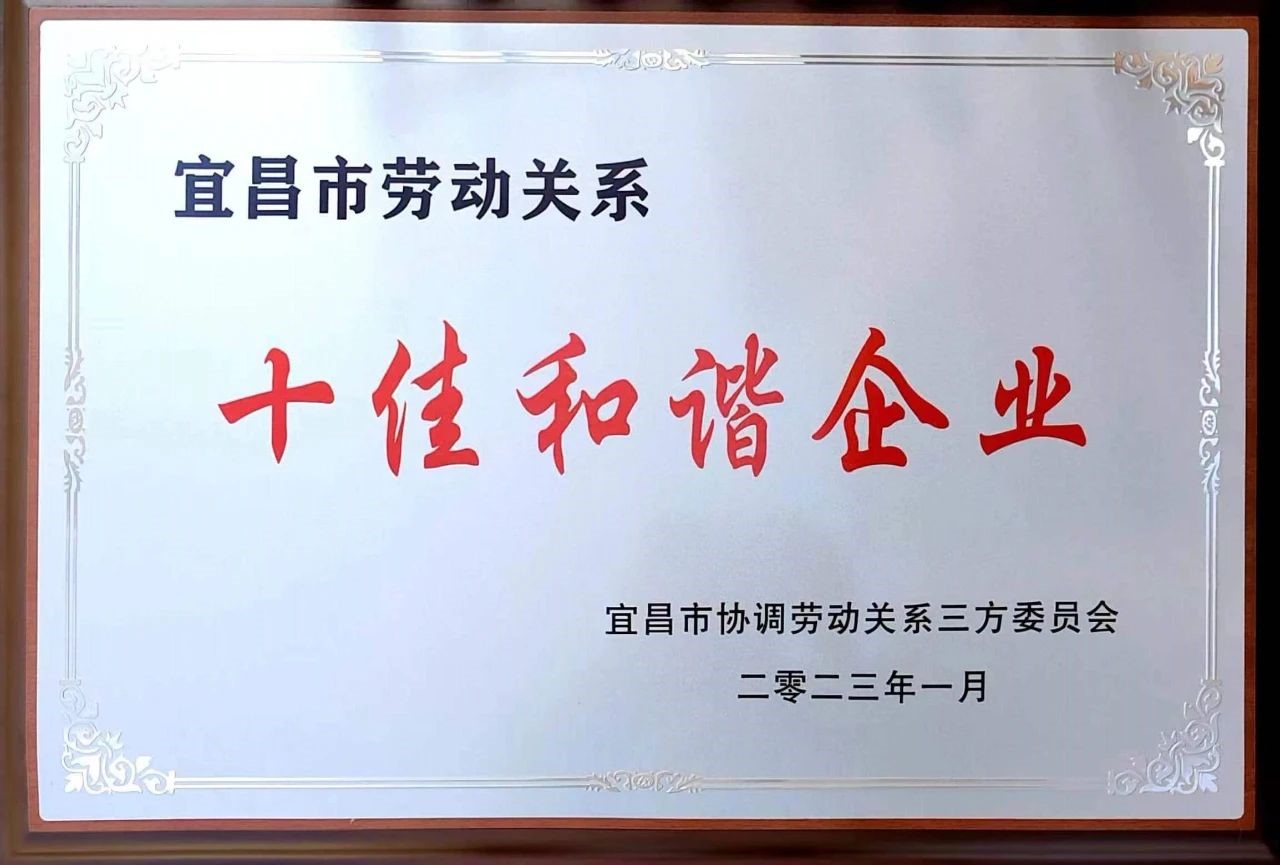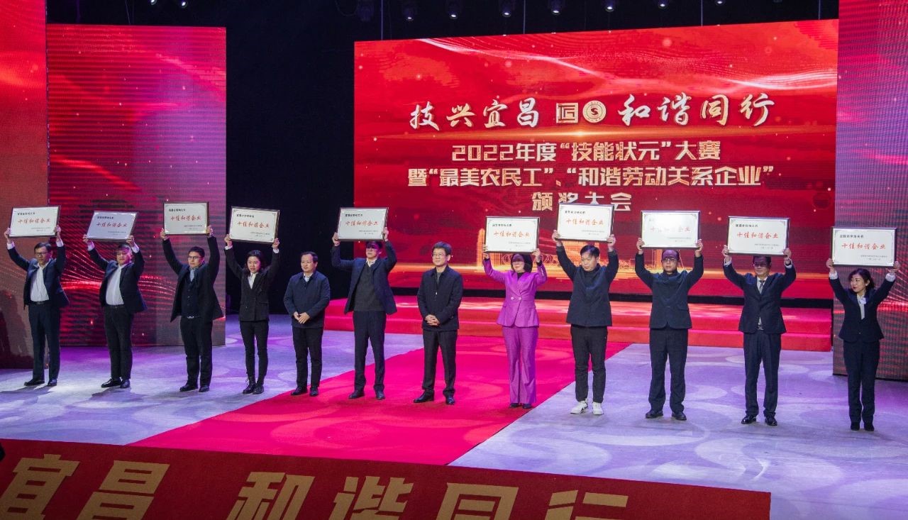 1月7日,宜昌市第三届劳动关系十佳和谐企业评选活动颁奖典礼在宜昌市广电中心一号演播大厅隆重举行。典礼表彰了宜昌市创建“劳动关系十佳和谐企业”及“最美农民工”“技能状元”代表,金年会|jinnianhui宜昌有限公司荣获宜昌市第三届“十佳和谐企业”称号。